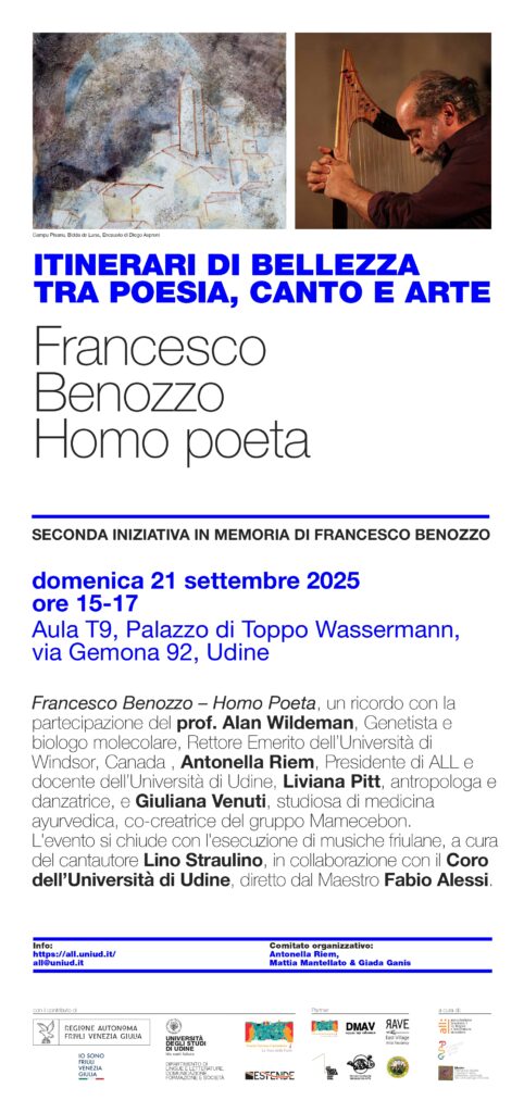 È con profondo dolore che la nostra associazione Laureati in Lingue si vede costretta ad annullare l’evento “Storie di grandi alberi. Sylvatica – Canti  sciamanici erranti” previsto per questa domenica 30 marzo a Malborghetto, a causa dell’improvvisa e tragica scomparsa del Prof. Francesco Benozzo, poeta, cantore, musicista e bardo, filologo.