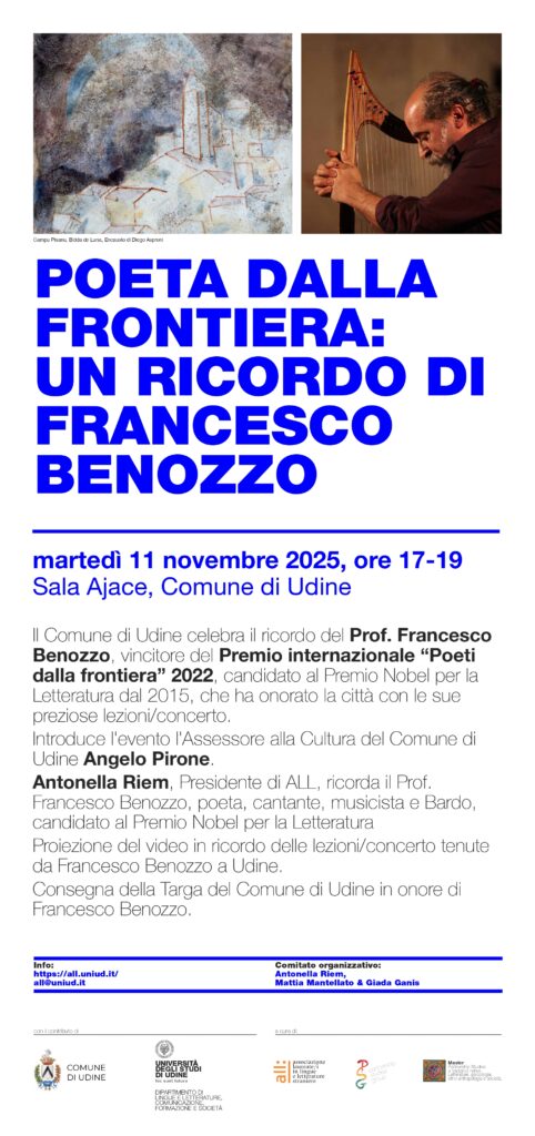 Nel 2022, il Comitato del Partnership Studies Group (USA, Australia, UK, Francia, e Italia), presieduto dalla Prof.ssa Riem, ha assegnato il premio “Poeti dalla frontiera” al Prof. Francesco Benozzo. A questi link si potrà conoscere meglio il poeta e anche ascoltare il suo canto e il suono della sua arpa: